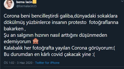 “Corona beni bencilleştirdi galiba, dünyadaki sokaklara dökülmüş yüzbinlerce insanın protesto fotoğraflarına bakarken, şu an salgının hızının nasıl arttığını düşünmeden edemiyorum… Kalabalık her fotoğrafta yayılan Corona görüyorum. Bu durumdan en kârlı covid çakacak yine…”