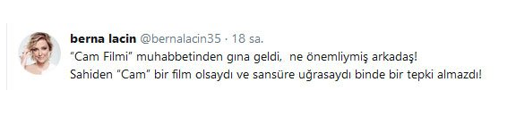 Cam filmlerine yasak gelmesinin ardından özellikle sosyal medyada başlayan tepkiler giderek siyasi liderlerin parti grup konuşmalarına kadar taşınan bir ülke meselesi haline geldi. Kısa zamanda böylesi bir örgütlenmenin gerçekleştiği cam filmi konusunda yaşadığı şaşkınlığı paylaşımına taşıyan Berna Laçin dikkat çekici satırlar yazdı. Kalabalıkların ülkedeki pek çok sorun konusunda duyarsız kalmasına rağmen cam filmi konusunda böylesi bir hırsla tepki göstermesine biraz da içerleyen Berna Laçin bahsi geçen konu bir sinema filmi olsaydı bu tepkinin binde birini bile göremezdik şeklinde hayıflandı. İşte oyuncu Berna Laçin’in o paylaşımı: