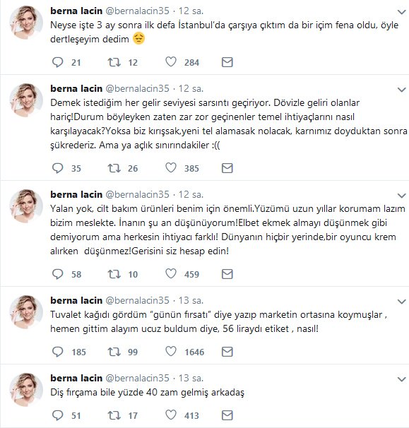 Tatil dönüşü ilk olarak evindeki ihtiyaçlar için alışverişe çıkan Berna Laçin, karşılaştığı ekonomik tabloyu sosyal medya hesabından yaptığı paylaşımlarla takipçilerine aktardı. Yaşanan ekonomik kriz yüzünden her gelir seviyesinin sarsıntı geçirdiğini söyleyen Laçin konuyla ilgili olarak şu tweetleri attı: