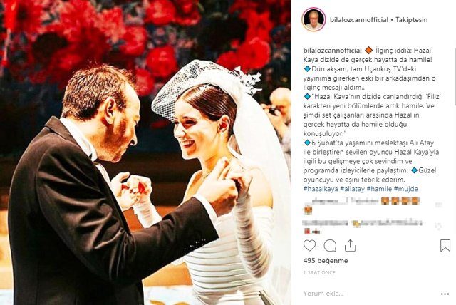 Ve şimdi set çalışanları arasında Hazal’ın gerçek hayatta da hamile olduğu konuşuluyor. 6 Şubat’ta yaşamını meslektaşı Ali Atay ile birleştiren sevilen oyuncu Hazal Kaya’yla ilgili bu gelişmeye çok sevindim ve programda izleyicilerle paylaştım. Güzel oyuncuyu ve eşini tebrik ederim.”