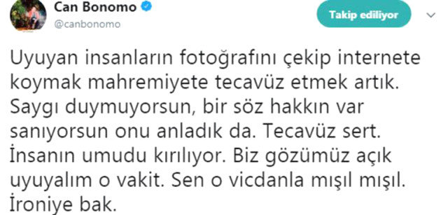 “Uyuyan insanların fotoğrafını çekip internete koymak mahremiyete tecavüz etmek artık. Saygı duymuyorsun, bir söz hakkın var sanıyorsun onu anladık da. Tecavüz sert. İnsanın umudu kırılıyor. Biz gözümüz açık uyuyalım o vakit. Sen o vicdanla mışıl mışıl. İroniye bak.”