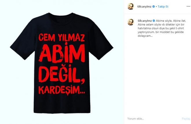 “Cem Yılmaz abim değil, kardeşim…” yazan bir tişört yaptıracağını belirten Can Yılmaz, “Abine söyle, Abine ilet, Abine selam söyle vb dilekler için bir hatırlatma olsun diye bu şekil t-shirt yaptırıyorum, bir müddet bu şekilde dolaşacağım” dedi.