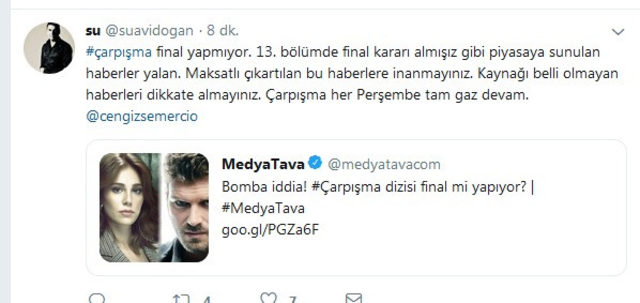 Show TV Genel Müdürü Suavi Doğan, kişisel Twitter hesabından yaptığı açıklama ile, Çarpışma dizisinin final yapacağı iddiasını yalanladı.