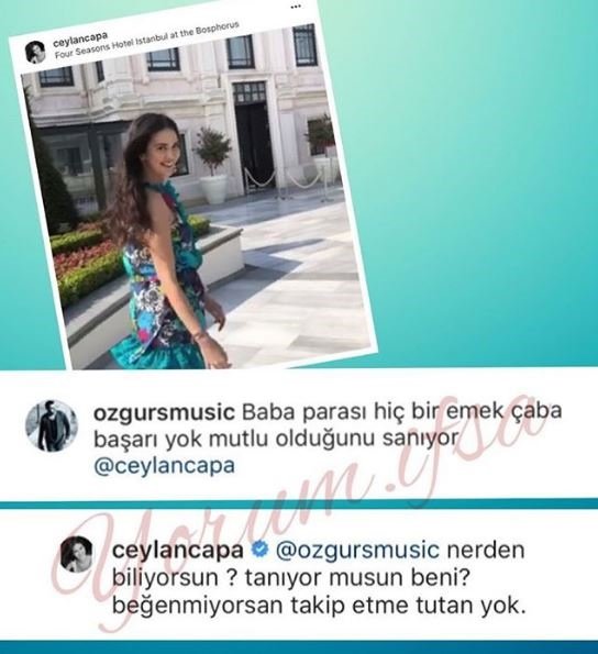 Ceylan Çapa bir takipçisinden “Baba parası hiçbir emek, çaba, başarı, yok. Mutlu olduğunu sanıyor” yorumunu aldı. Ceylan Çapa, bu yoruma sinirlenerek ” Nereden biliyorsun? Tanıyor musun beni? Beğenmiyorsan takip etme, tutan yok” diyerek tepki gösterdi.