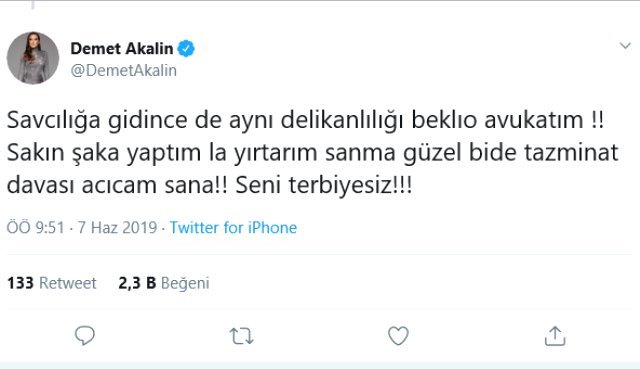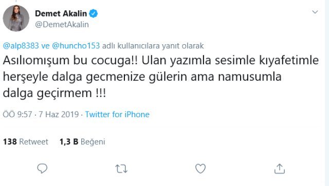 Şarkıcı Demet Akalın, bir sosyal medya kullanıcısının “Fotoğraflarını görüyorum çok yakışıklısın canım. Biz konser için Adana’ya da geleceğiz haberin olsun” mesajını görünce çileden çıktı. Akalın mesaja, “Namusumla dalga geçirmem” diyerek sert çıktı.