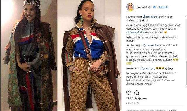 Demet Akalın’ın çoraplı stilinden sonra Rihanna da Instagram hesabından çoraplı bir fotoğraf paylaşmıştı ve çok sayıda beğeni almıştı. Hal böyle olunca Demet Akalın hayranları ‘Rihanna yapınca vay, Demet Akalın yapınca ıy’ oluyor şeklinde yorumlar yapmıştı.