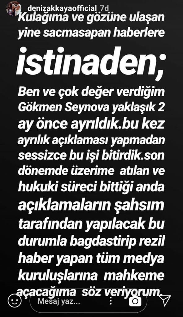 Hakkında tehdit ve gasp suçlaması olan Deniz Akkaya, Gökmen Şeynova’nın ailesinden veto yediği ve aşklarının böylelikle bittiği iddia edildi. Deniz Akkaya iddiaların ardından yaptığı açıklamada konuyu mahkemeye taşıyacağını söyledi.