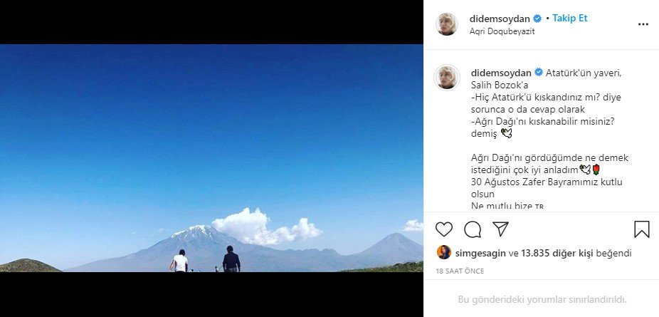 “Atatürk’ün yaveri, Salih Bozok’a ‘Hiç Atatürk’ü kıskandınız mı?’ diye sorunca o da cevap olarak ‘Ağrı Dağı’nı kıskanabilir misiniz?’ demiş. Ağrı Dağı’nı gördüğümde ne demek istediğini çok iyi anladım. 30 Ağustos Zafer Bayramımız kutlu olsun