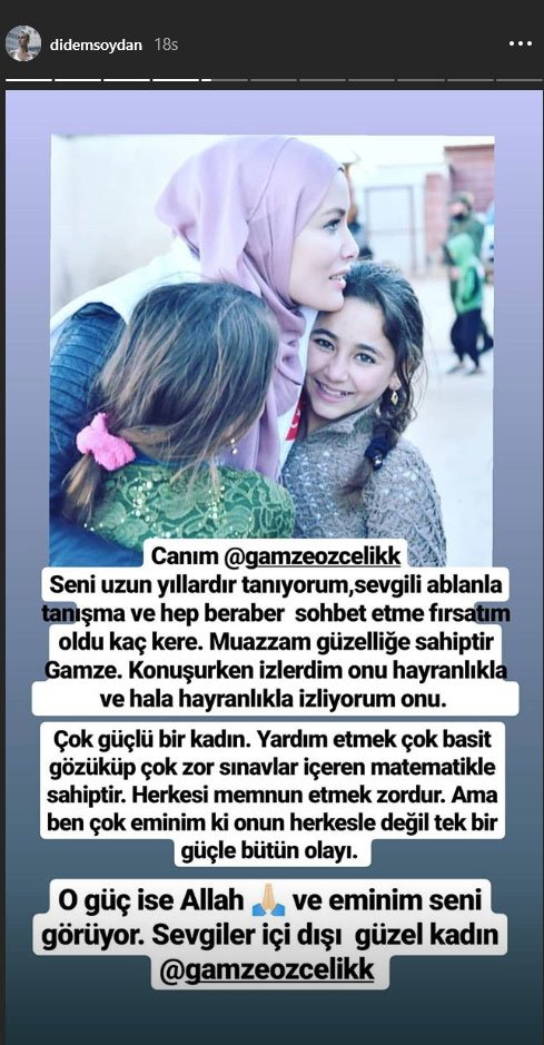 Sosyal medya hesabından takipçileriyle paylaştığı cesur fotoğraflarla gündeme sık sık gelen ünlü model Didem Soydan, Gamze Özçelik hakkındaki düşüncelerini açıkladı. Instagram hesabından Gazme Özçelik’in fotoğrafını paylaşan Didem Soydan fotoğrafa, “Canım Gamze Özçelik, seni uzun yıllardır tanıyorum, sevgili ablanla tanışma ve hep beraber sohbet etme fırsatım oldu kaç kere. Muazzam güzelliğe sahiptir Gamze. Konuşurken izlerdim onu hayranlık ve hala hayranlıkla izliyorum onu. Çok güçlü bir kadın. Yardım etmek çok basit gözüküp çok zor sınavlar içeren matematikle sahiptir. Herkesi memnun etmek zordur. Ama ben çok eminim ki onun herkesle değil tek bir güçle bütün olayı. O güç ise Allah ve eminim seni görüyor. Sevgiler içi dışı güzel kadın Gamze Özçelik” notunu ekledi.