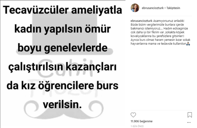 Instagram hesabında 330 bin takipçisi bulunan Şancı’nın “Tecavüzcüleri kadın yapıp ömür boyu genelevlerde çalıştıralım” teklifi kan dondurdu. İki çocuk annesi bir kadın olan Şancı’nın kadın varlığını aşağılayan akıl almaz ifadeleri büyük tepki çekti.