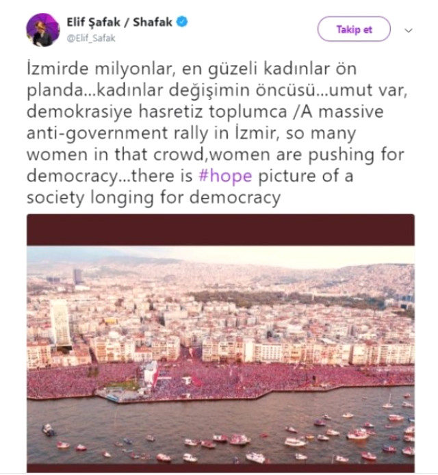 CHP’nin Cumhurbaşkanı adayı Muharrem İnce’nin Twitter hesabından yaptığı paylaşımları RT eden Elif Şafak, İzmir mitinginde kadınların ön sıralarda yer aldığına dikkat çekti.