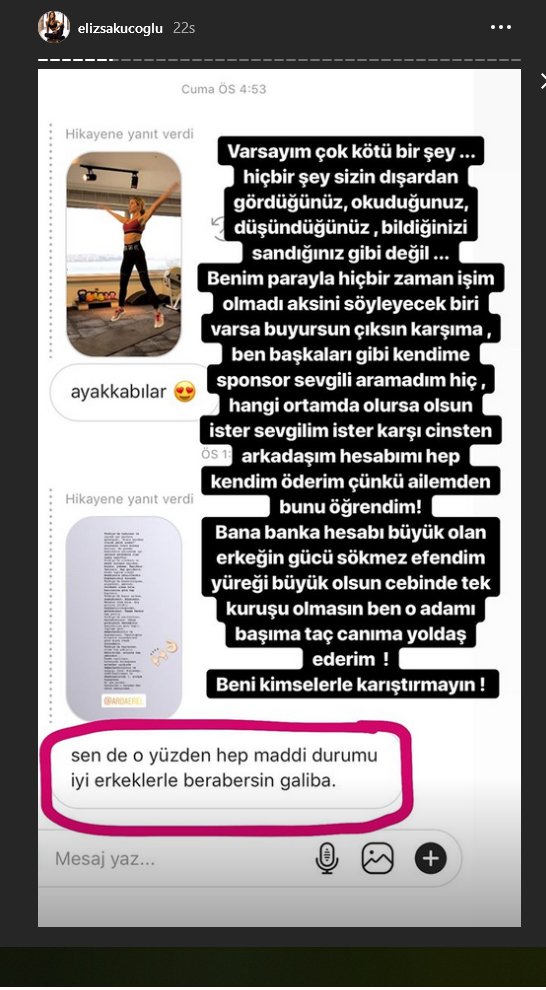 Sosyal medya hesabından paylaştığı spor videoları ile dikkatleri üzerine çeken ve fit vücuduyla özellikle yaz aylarına damga vuran Eliz Sakuçoğlu bu defa takipçilerine tüm samimiyetiyle seslendi. Ayakkabılarını çok beğendiğini gösterdiği paylaşımının altına yapılan “Sen de o yüzden hep maddi durumu iyi erkeklerle berabersin galiba” yorumunu okuyunca adeta çileden çıkan Sakuçoğlu bu paylaşımla ilgili olarak şunları yazdı: