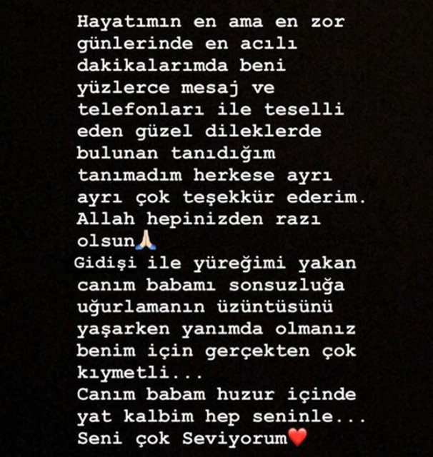 Ün, acı gününde yalnız bırakmayan dostlarına, “Hayatımın en ama en zor günlerinde, en acılı dakikalarımda beni yüzlerce mesaj ve telefonları ile teselli eden, güzel dileklerde bulunan tanıdığım, tanımadığım herkese ayrı ayrı çok teşekkür ederim. Allah hepinizden razı olsun. Gidişi ile yüreğimi yakan canım babamı sonsuzluğa uğurlamanın üzüntüsünü yaşarken yanımda olmanız benim için gerçekten çok kıymetli. Canım babam huzur içinde yat, kalbim hep seninle. Seni çok seviyorum…” sözleriyle teşekkür etti.
