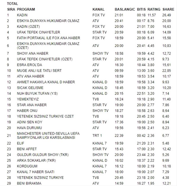 Reyting listesinde birinci sırada yine Kadın dizisi olurken ikinci Eşkıya Dünyaya Hükümaz Olmaz dizisi 2. sırada yer aldı. Kadın dizisinin özeti bile Ufak Tefek Cinayetler’i geçti.
