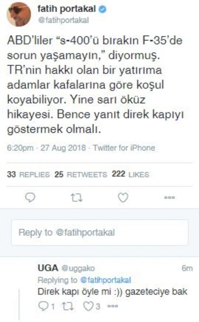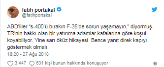 Portakal, sosyal medya hesabından yaptığı paylaşımda “S-400’ü bırakın F-35’de sorun yaşamayın,” diyormuş. TR’nin hakkı olan bir yatırıma adamlar kafalarına göre koşul koyabiliyor. Yine sarı öküz hikayesi. Bence yanıt direk kapıyı göstermek olmalı.” ifadelerini kullandı.