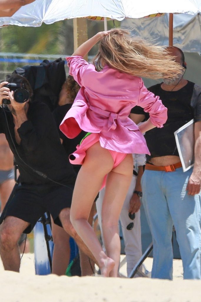 Sahilde gerçekleşen çekimlerde pembe blazer ceketi ve Cynthia Rowley marka 2500 değerinde bir wetsuit yani dalgıç elbisesi giyen Hadid’i rüzgar bir türlü rahat bırakmadı.
