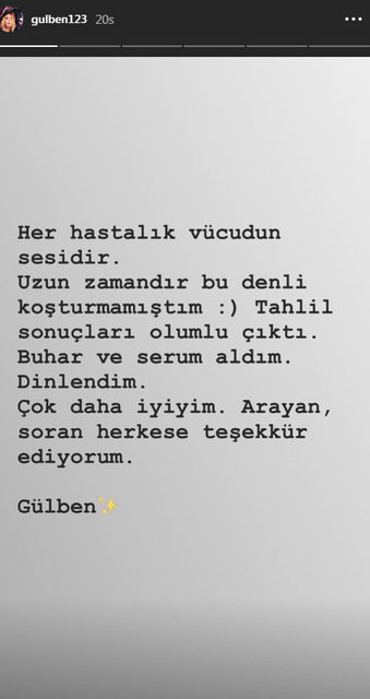 Ergen, sosyal medya hesabından, “Her hastalık vücudun sesidir. Uzun zamandır bu denli koşturmamıştım. Tahlil sonuçları olumlu çıktı. Buhar ve serum aldım. Dinlendim. Çok daha iyiyim. Arayan, soran herkese teşekkür ediyorum.” açıklamasını yaptı.(Habertürk)