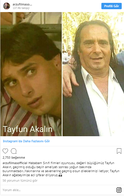“Hababam Sınıfı filmleri oyuncusu, değerli büyüğümüz Tayfun Akalın, geçirmiş olduğu beyin ameliyatı sonrası yoğun bakımda bulunmaktadır. Yakınlarına ve sevenlerine geçmiş olsun dileklerimizi iletiyor, Tayfun Akalın ağabeyimize acil şifalar diliyoruz.”