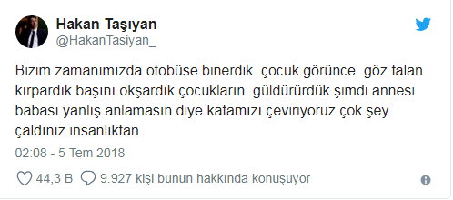 Arabeskin yaşayan isimlerinden Hakan Taşıyan , “Bizim zamanımızda otobüse binerdik. çocuk görünce göz falan kırpardık başını okşardık çocukların. güldürürdük şimdi annesi babası yanlış anlamasın diye kafamızı çeviriyoruz çok şey çaldınız insanlıktan..” diyerek sosyal medya aracılığı ile tepkisini dile getirdi.