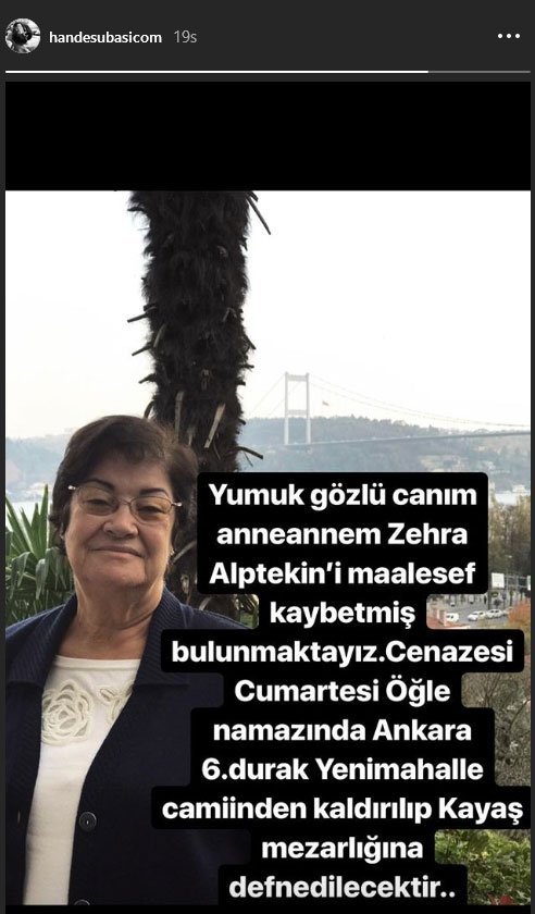 Ekranların başarılı oyuncularından Hande Subaşı sosyal medya hesabı üzerinden takipçileriyle bir acısını paylaştı. Anneannesi Zehra Alptekin’in vefat ettiği haberini takipçileri ve sevenleriyle paylaşan Subaşı defin işlemleriyle ilgili de bilgi verdi.