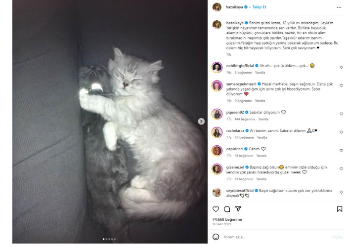 Ünlü oyuncu Hazal Kaya hayatını kaybeden kedisi Leyla’ya sosyal medyadan veda etti. Ünlü oyuncu, üzüntüsünü “Bu özlem hiç bitmeyecek biliyorum. Seni çok seviyorum” sözleriyle dile getirdi.