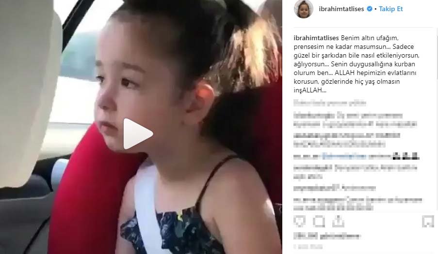 İmparator lakaplı türkücü İbrahim Tatlıses, Ayşegül Yıldız’la olan evliliğinden dünyaya gelen küçük kızı Elif Ada’nın sosyal medya sayfasından bir videosunu paylaştı. Tatlıses paylaşımın altına;”Benim altın ufağım, prensesim ne kadar masumsun… Sadece güzel bir şarkıdan bile nasıl etkileniyorsun, ağlıyorsun… Senin duygusallığına kurban olurum ben… Allah hepimizin evlatlarını korusun, gözlerinde hiç yaş olmasın inşallah…” notunu düştü.