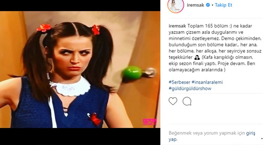Güldür Güldür’ün sevilen oyuncularından İrem Sak, 165 bölümdür dahil olduğu projeden ayrıldığını açıkladı.