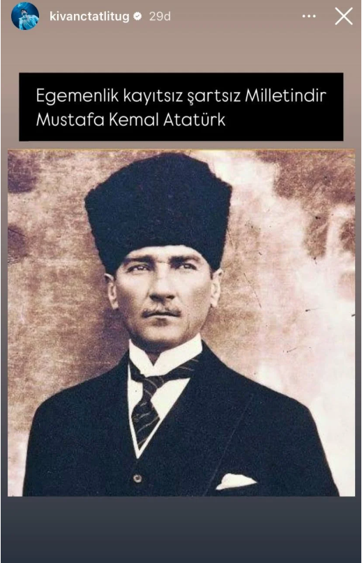 Bir paylaşım da oyuncu Kıvanç Tatlıtuğ’dan geldi. Tatlıtuğ, Instagram hesabından Atatürk’ün “Egemenlik kayıtsız şartsız milletindir” sözünü yayınladı.
