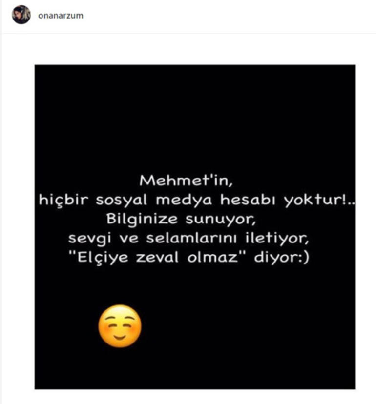 Arzum Onan, sosyal medya hesabından yaptığı açıklamada şunları yazdı: Mehmet’in hiçbir sosyal medya hesabı yoktur! Bilginize sunuyor,sevgi ve selamını iletiyor,” Elçiye zeval olmaz” diyor…