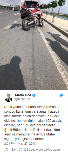 Uca paylaşımında, ““Sahil yolunda motosiklet çarpması sonucu karıştığım yaralamalı kazada kısa sürede gelen deneyimli 112 acil ekibine, hemen önlem alan 155 asayiş ekibine, her türlü desteği sağlayan Şehit Bülent Üstün Polis Merkezi tüm amir ve memurlarına ayrıca Mafre sigorta’ya teşekkür ederim” dedi.(Cumhuriyet)