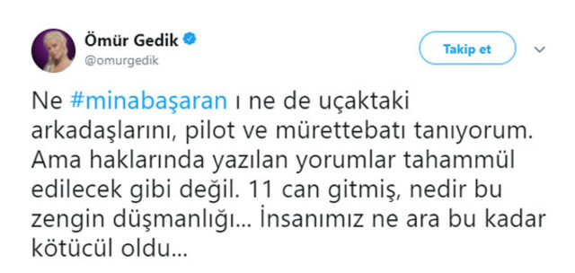 Ne Mina Başaran’ı ne de uçaktaki arkadaşlarını, pilot ve mürettebatı tanıyorum. Ama haklarında yazılan yorumlar tahammül edilecek gibi değil. 11 can gitmiş, nedir bu zengin düşmanlığı… İnsanımız ne ara bu kadar kötücül oldu…