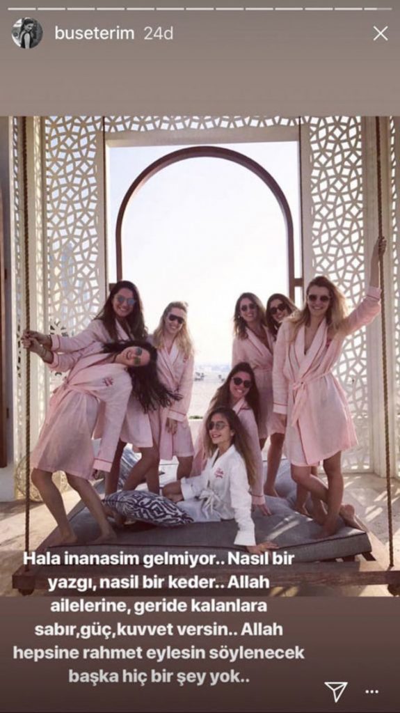 Birleşik Arap Emirlikleri’nden İstanbul’a giden Başaran Yatırım Holding’e ait özel jet düştü. 3’ü mürettebat 11 kadın hayatını kaybetti. Jette Hüseyin Başaran’ın bekarlığa veda partisinden dönen kızı Mina Başaran ve 7 arkadaşı vardı. Aralarında Yıldız Tilbe, Şeyma Subaşı Buse Terim ve Ömür Gedik’in de bulunduğu sanat ve sosyete camiasının tanınan isimleri Mina Başaran ve arkadaşlarına böyle veda etti…