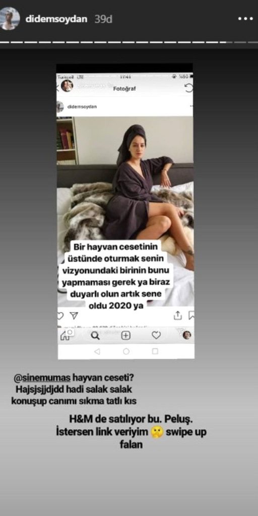 Didem Soydan’ın paylaşımını gören eski gelin adayı Sinem Umaş, “Bir hayvanın cesetinin üstünde oturmak senin vizyonundaki birinin bunun yapmaması gerek ya. Biraz duyarlı olun artık sene oldu 2020.” diyerek eleştirdi.