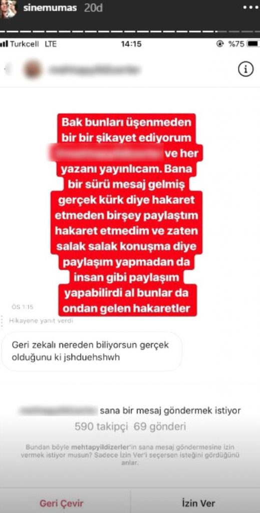 Didem Soydan’ı bilmeden eleştiren Sinem Umaş, kısa sürede tepkilerin odağı oldu. Umaş kendisine gelen hakaret içerikli mesajları sosyal medya hesabından paylaşarak “Bak bunları üşenmeden bir bir şikayet ediyorum. Her yazanı yayınlayacağım. Bana bir sürü mesaj gelmiş gerçek kürk diye. Hakaret etmedim ve zaten ‘salak salak konuşma’ diye paylaşım yapmadan da insan gibi paylaşım yapabilirdi al bunlar da ondan gelen hakaretler.” dedi.