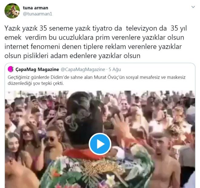 “Yazık yazık 35 seneme yazık. Tiyatroda televizyonda 35 yıl emek verdim. Bu ucuzluklara prim verenlere yazıklar olsun. İnternet fenomeni denen tiplere reklam verenlere yazıklar olsun. Pislikleri adam edenlere yazıklar olsun.”