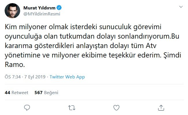 Yıldırım, Twitter hesabından yaptığı açıklamada, “Kim milyoner olmak isterdeki sunuculuk görevimi oyunculuğa olan tutkumdan dolayı sonlandırıyorum.Bu kararıma gösterdikleri anlayıştan dolayı tüm ATV yönetimine ve milyoner ekibime teşekkür ederim. Şimdi Ramo.” ifadelerini kullandı.