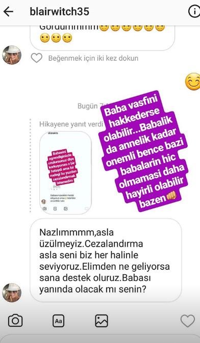 Nazlı Hamarat, bir başka takipçisinin ‘Babası yanında olacak mı senin?’ diye soran takipçisine ise ‘^Baba vasfını hak ederse olabilir…Babalık da annelik kadar önemli bence.Bazı babaların hiç olmaması daha hayırlı olabilir bazen’ diye cevap verdi.