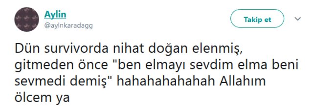 Nihat Doğan veda konuşmasında “Çok istedim ama Nazım Hikmet’in Çok güzel bir sözü var. Diyor ki, ‘Ben elmayı sevdim. Elma beni sevmedi’… Ben Survivor’ı sevdim ama Survivor beni sevmemiş demek ki. Biz kadere iman etmiş insanlarız” ifadelerini kullandı.