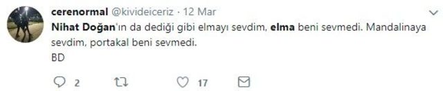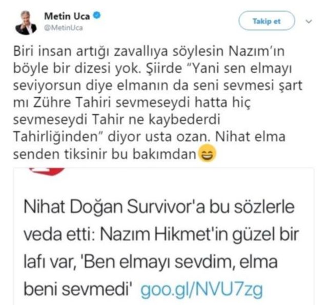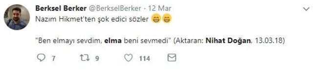 Nihat Doğan’ın iddia ettiği gibi Nazım Hikmet’in “Ben elmayı sevdim. Elma beni sevmedi” diye sözü bulunmaması sosyal medyada tepkilere neden oldu.