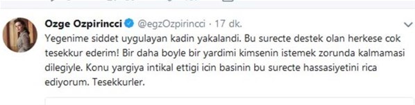 Yeğenime şiddet uygulayan kadın yakalandı. Bu süreçte destek olan herkese çok teşekkür ederim! Bir daha böyle bir yardımı kimsenin istemek zorunda kalmaması dileğiyle. Konu yargıya intikal ettiği için basının bu süreçte hassasiyetini rica ediyorum. Teşekkürler.(Gazetevatan)