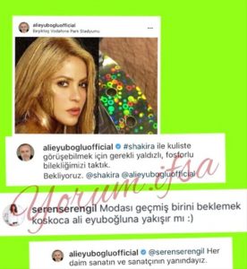 Lübnan asıllı Kolombiyalı şarkıcı, söz yazarı, dansçı ve oyuncu Shakira, ”El Dorado Dünya Turnesi” kapsamında geldiği İstanbul’da, Vodafone Park’ta konser verdi. Konsere akın eden ünlülerin yanı sıra birçok gazeteci Shakira ile görüşmek için sıraya girdi. Bu kişilerin arasında Ali Eyüpoğlu’nun olduğu öğrenen Seren Serengil, “Modası geçmiş birini beklemek sana yakışır mı?” yorumunu yaptı. Serengil’in bu yorumunu gören bazı kullanıcılar, “Tam Seren’e yakışır bir cümle” yorumunu yaptı.