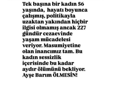 Sarıkaya, “Tek başına bir kadın 56 yaşında, hayatı boyunca çalışmış, politikayla uzaktan yakından hiçbir ilgisi olmamış ancak 227 gündür cezaevinde yaşam mücadelesi veriyor. Masumiyetine olan inancımız tam. Bu kadın sessizlik içerisinde bu kadar aydır ölümünü bekliyor. Ayşe Barım ÖLMESİN!” ifadelerini kullandı.