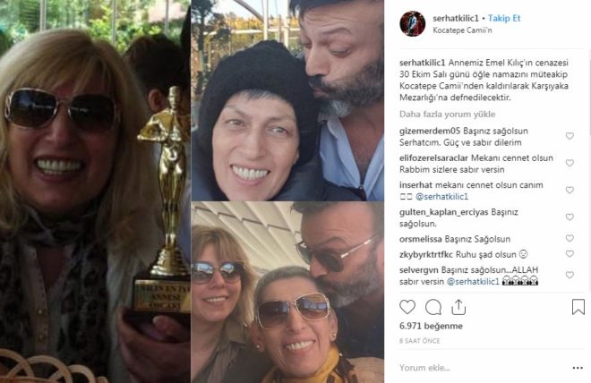 Oyuncu Serhat Kılıç, annesi Emel Kılıç’ı kaybetmesinin acısını yaşıyor. Instagram hesabından “Emel Kılıç! Dünyanın en güzel, en cefakar, en vefakar, en şefkatli, en yetenekli, en komik, en çok özlenecek annesi” notuyla annesini kaybettiğini duyuran Serhat Kılıç, “Annemiz Emel Kılıç’ın cenazesi 30 Ekim Salı günü öğle namazını müteakip Kocatepe Camii’nden kaldırılarak Karşıyaka Mezarlığı’na defnedilecektir” notuyla fotoğraf paylaştı. Fotoğrafın altına başsağlığı yorumları yağdı.
