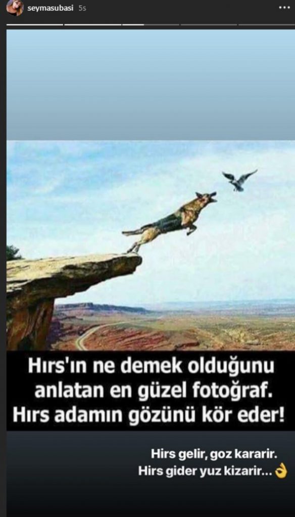 Şeyma Subaşı paylaşımına, “Hırsın ne demek olduğunu anlatan en güzel fotoğraf. Hırs adamın gözünü kör eder! Hırs gelir, göz kararır. Hırs gider yüz kızarır” notunu ekledi.