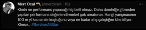 Öcal Twitter hesabından, “Kimin ne performans yapacağı hiç belli olmaz. Daha Dominik’e gitmeden yapılan performans değerlendirmeleri çok amatörce. Hangi yarışmacının 100m’yi kaç saniyede koştuğunu veya ne kadar atış çalıştığını kim biliyor?” yazdı.