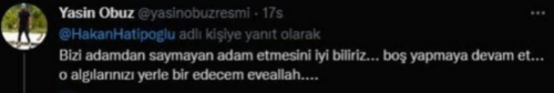 Hatipoğlu’na ilk tepki Yasin Obuz’dan geldi. Obuz, “Bizi adamdan saymayanı, adam etmesini iyi biliriz. Boş yapmaya devam et…O algılarınızı yerle bir edeceğim evelallah” diyerek cevap verdi.