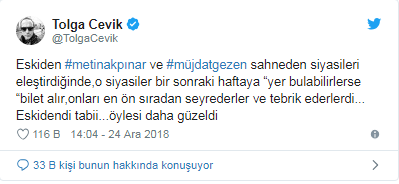 Ünlü komedyen ve oyuncu Tolga Çevik, katıldıkları bir televizyon programında kullandıkları ifadeler üzerine AKP Cumuhurbaşkanı Recep Tayyip Erdoğan tarafından hedef gösterilen ve ardından gözaltına alınan Metin Akpınar ile Müjdat Gezen ile ilgili kişisel Twitter hesabından bir tweet attı. Yaşananlara tepki gösteren Çevik, tweetinde “Eskiden #metinakpınar ve #müjdatgezen sahneden siyasileri eleştirdiğinde,o siyasiler bir sonraki haftaya “yer bulabilirlerse “bilet alır,onları en ön sıradan seyrederler ve tebrik ederlerdi… Eskidendi tabii…öylesi daha güzeldi” ifadelerini kullandı.