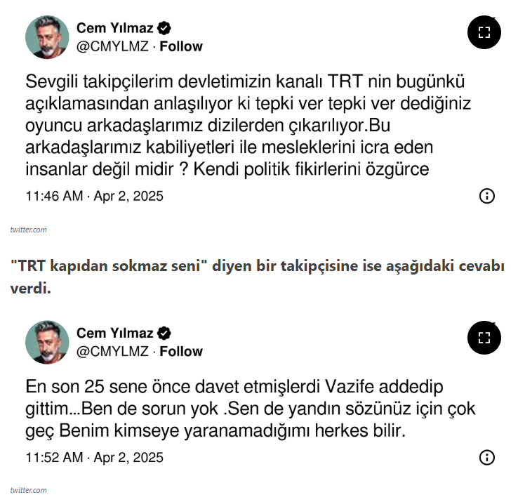 Cem Yılmaz da sosyal medya paylaşımında, “Sevgili takipçilerim devletimizin kanalı TRT nin bugünkü açıklamasından anlaşılıyor ki tepki ver tepki ver dediğiniz oyuncu arkadaşlarımız dizilerden çıkarılıyor. Bu arkadaşlarımız kabiliyetleri ile mesleklerini icra eden insanlar değil midir? Kendi politik fikirlerini özgürce ifade eden insanlar TRT yapımlarında görev alamıyor mı yani? TRT bizim devlet kanalı değil miydi? Üzgünüm TRT bu konuda tarafsız olman gerekiyordu! Herkese tavsiye ettiğin şeyi sen de yapmalısın! O zaman halkın sevdiği oyuncular TRT de çalışmasın demek oluyor bu! İstemeyen TRT katkı payı ödemesin de diyebilir misin ? Hayır diyemezsin. E halde?” düşüncesini dile getirdi.