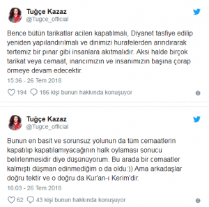 Mankenlik ve oyunculuğu bıraktıktan sonra Twitter’da gündeme ilişkin attığı tweet’lerle tanınan Tuğçe Kazaz tarikatlarla ilgili bir paylaşımda bulundu. Diyanet ‘in tasfiye edilmesi gerektiğini belirten Kazaz, “Bence bütün tarikatlar acilen kapatılmalı” çağrısı yaptı. Bu uygulama için halk oylaması da isteyen Kazaz’ın tweet’i şöyle: