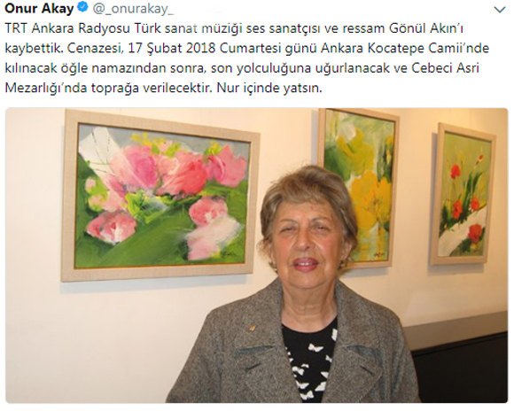 Twitter adresinden sanatçının fotoğrafı ile birlikte cenaze bilgilerini de yazan Akay, “TRT Ankara Radyosu Türk sanat müziği ses sanatçısı ve ressam Gönül Akın’ı kaybettik. Cenazesi, 17 Şubat 2018 Cumartesi günü Ankara Kocatepe Camii’nde kılınacak öğle namazından sonra, son yolculuğuna uğurlanacak ve Cebeci Asri Mezarlığı’nda toprağa verilecektir. Nur içinde yatsın.” ifadelerini kullandı.